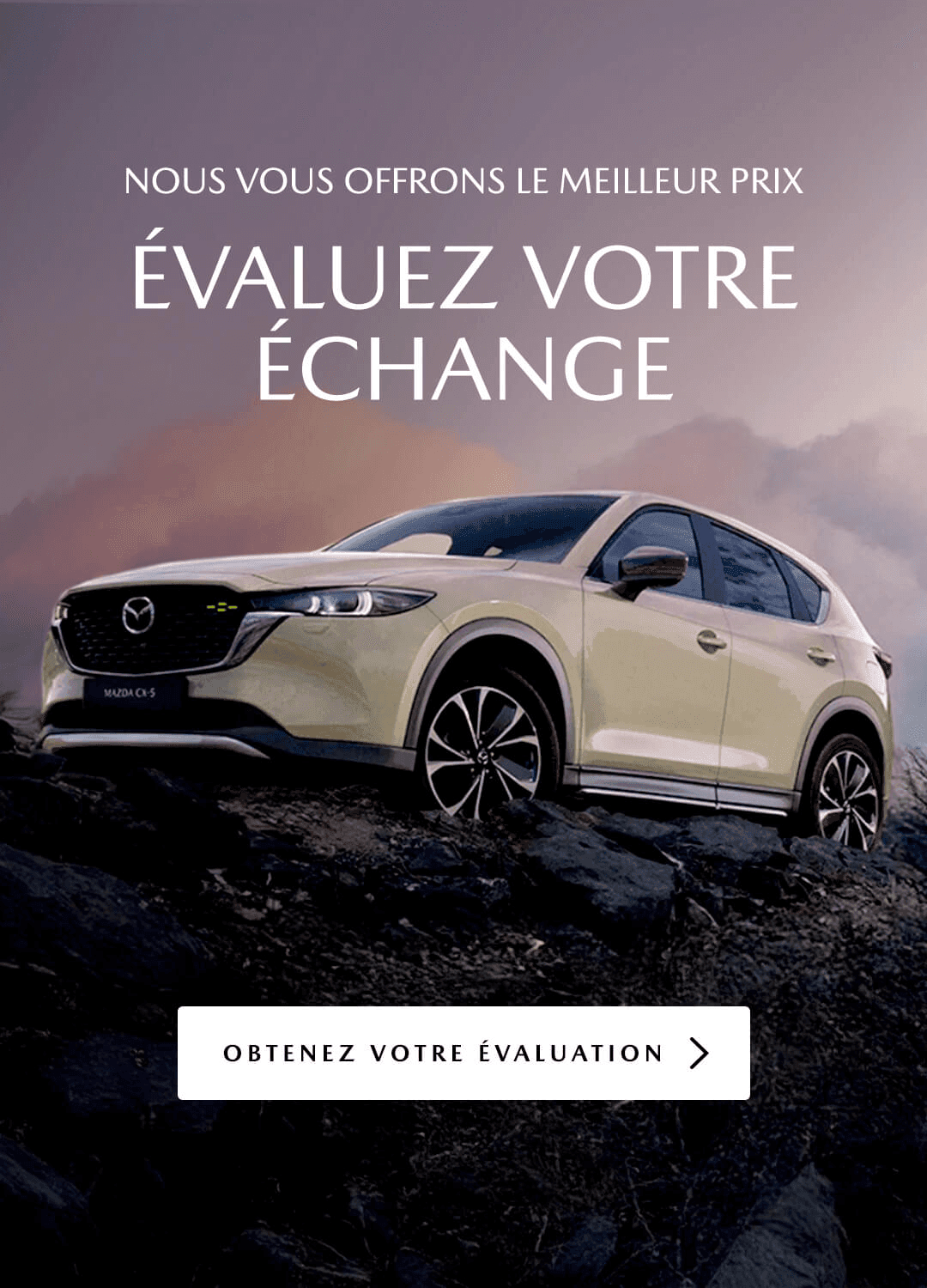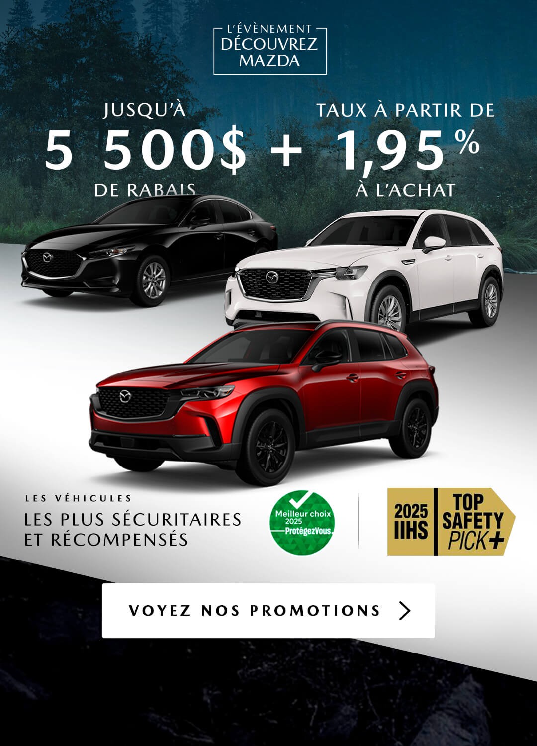 La gamme de VUS Mazda comporte des modèles pour tous les goûts et tous les budgets, mais qui offrent tous une silhouette raffinée, un volume utilitaire intéressant de même qu’une longue liste de caractéristiques de série et livrables. Que vous optiez pour le compact CX-3 neuf, le populaire Mazda CX-5 2022 – le plus vendu, le tout nouveau CX-50 2022 ou encore l’élégant CX-9 2022 et ses 3 rangées de sièges, vous êtes assurés, en optant pour l’un de ces 3 VUS Mazda, de profiter d’un véhicule parfait pour la famille; venez les voir de plus près dès aujourd’hui!