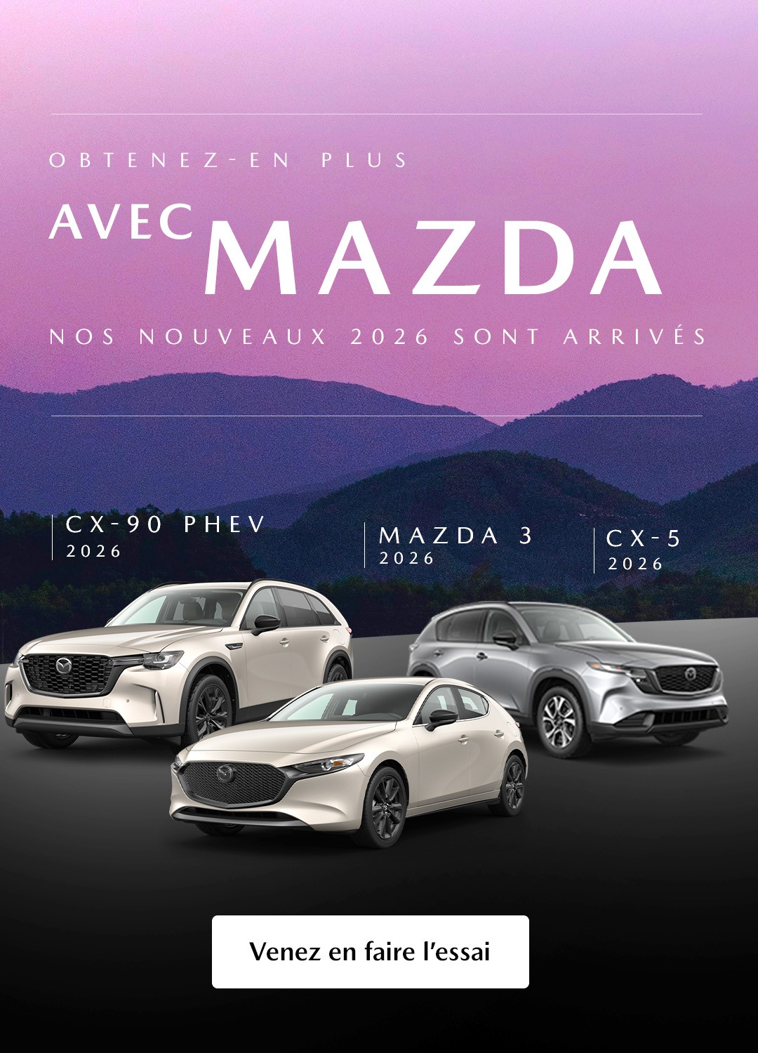 La gamme de VUS Mazda comporte des modèles pour tous les goûts et tous les budgets, mais qui offrent tous une silhouette raffinée, un volume utilitaire intéressant de même qu’une longue liste de caractéristiques de série et livrables. Que vous optiez pour le compact CX-3 neuf, le populaire Mazda CX-5 2022 – le plus vendu, le tout nouveau CX-50 2022 ou encore l’élégant CX-9 2022 et ses 3 rangées de sièges, vous êtes assurés, en optant pour l’un de ces 3 VUS Mazda, de profiter d’un véhicule parfait pour la famille; venez les voir de plus près dès aujourd’hui!