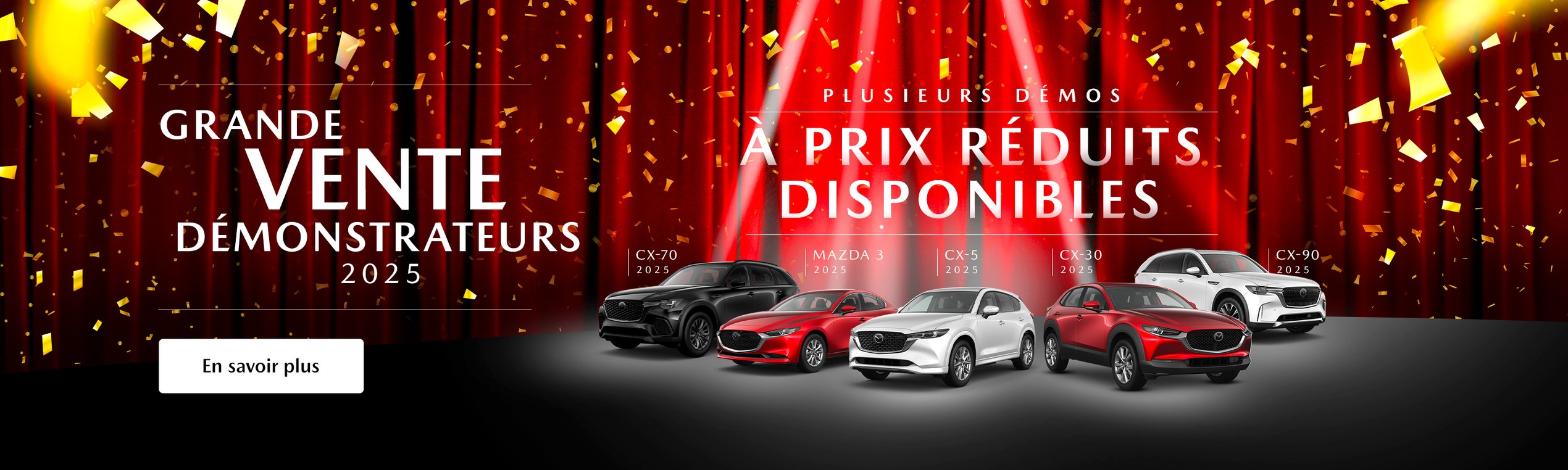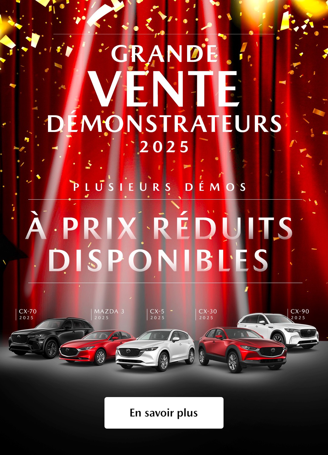 Le plus grand choix de véhicules Mazda à vendre se trouve chez votre concessionnaire Mazda à Granby! Situés en Montérégie, nous vous proposons les meilleurs prix en ville sur nos modèles neufs et d’occasion; renseignez-vous aussi sur nos options de financement Mazda, nos promotions et nos offres de location Mazda! Peu importe vos besoins et votre budget, vous trouverez chez nous le véhicule qui répondra à vos attentes; voici un aperçu des modèles que vous retrouverez chez nous.