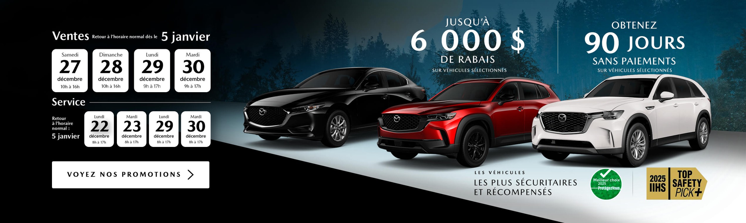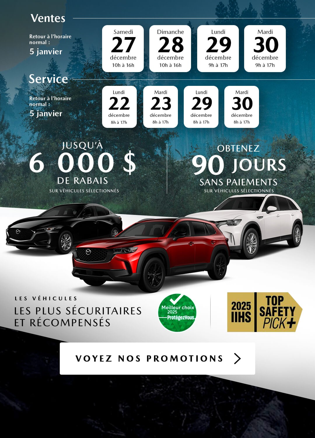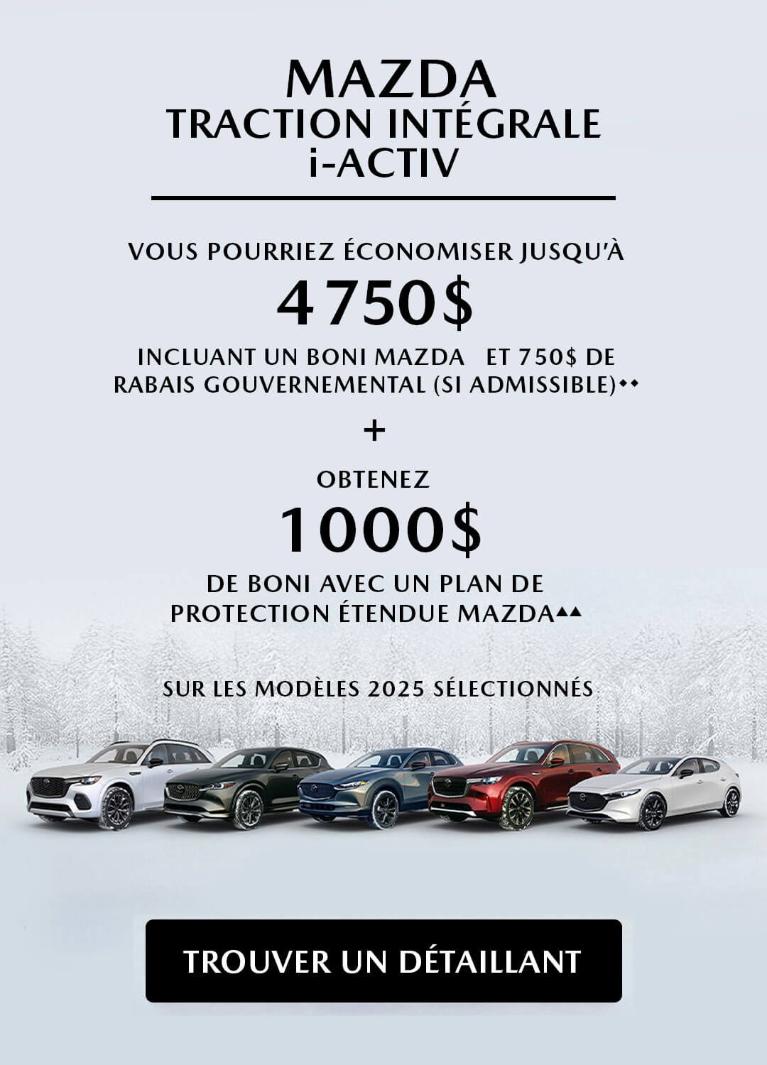 Vous aurez également l’embarras du choix parmi nos véhicules Mazda d’occasion, dont plusieurs Mazda3 usagées et CX-5 usagés, offerts aux meilleurs prix à Granby! Ne tardez plus et passez chez votre concessionnaire Mazda à Granby dès aujourd’hui; votre prochain véhicule Mazda vous attend!